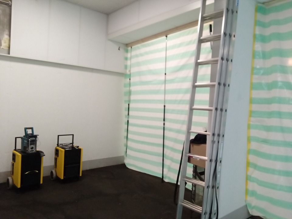 Der Trocknungsaufbau wurde nach dem Aufbau einer Teilfläche beurteilt. Es wurde der Luftdurchsatz durch die Dämmschichten gemessen und ein Bohrlochabstand von 1 m ermittelt. Die Anlage wurde im Saugverfahren (Unterdruckverfahren) mit Luftreinigungsgeräten und Filtern in den einzelnen Bohrlöchern installiert, um die Perliteschüttung nicht auszusaugen, da heutzutage eine Drucktrocknung aufgrund der Gefahr der Verunreinigung der Raumluft nicht mehr zu angewandt wird. Die gesamte Schlauchverlegung zu den einzelnen Bohrlöchern erfolgte im Randbereich oder in einer Höhe von ca. 2,30 m, damit die Nutzung des Fitnesscenters durch die Vereinsmitglieder gewährleistet werden konnte.